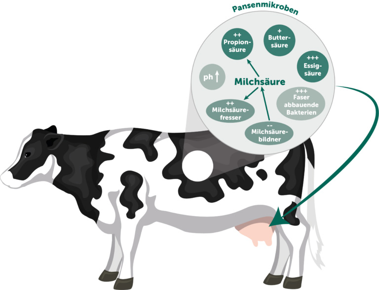 Aus dem intensivierten Faserabbau entsteht eine deutlich höhere Menge Essigsäure. Die Veränderung in der gesamten Mikrobenpopulation führt außerdem dazu, dass mehr flüchtige Fettsäuren wie Buttersäure und Propionsäure produziert werden. Alle diese Stoffwechselprodukte kann das Tier energetisch nutzen. Aus Propionsäure, die überwiegend schon im Pansen absorbiert wird, entsteht in der Leber Glukose, ein universeller Energielieferant. Essig- und Buttersäure können ebenfalls energetisch genutzt werden, entweder direkt in den Zellen oder ebenfalls mit Umweg über die Leber. Des weiteren dienen beide der Synthese von Körper- und Milchfett.