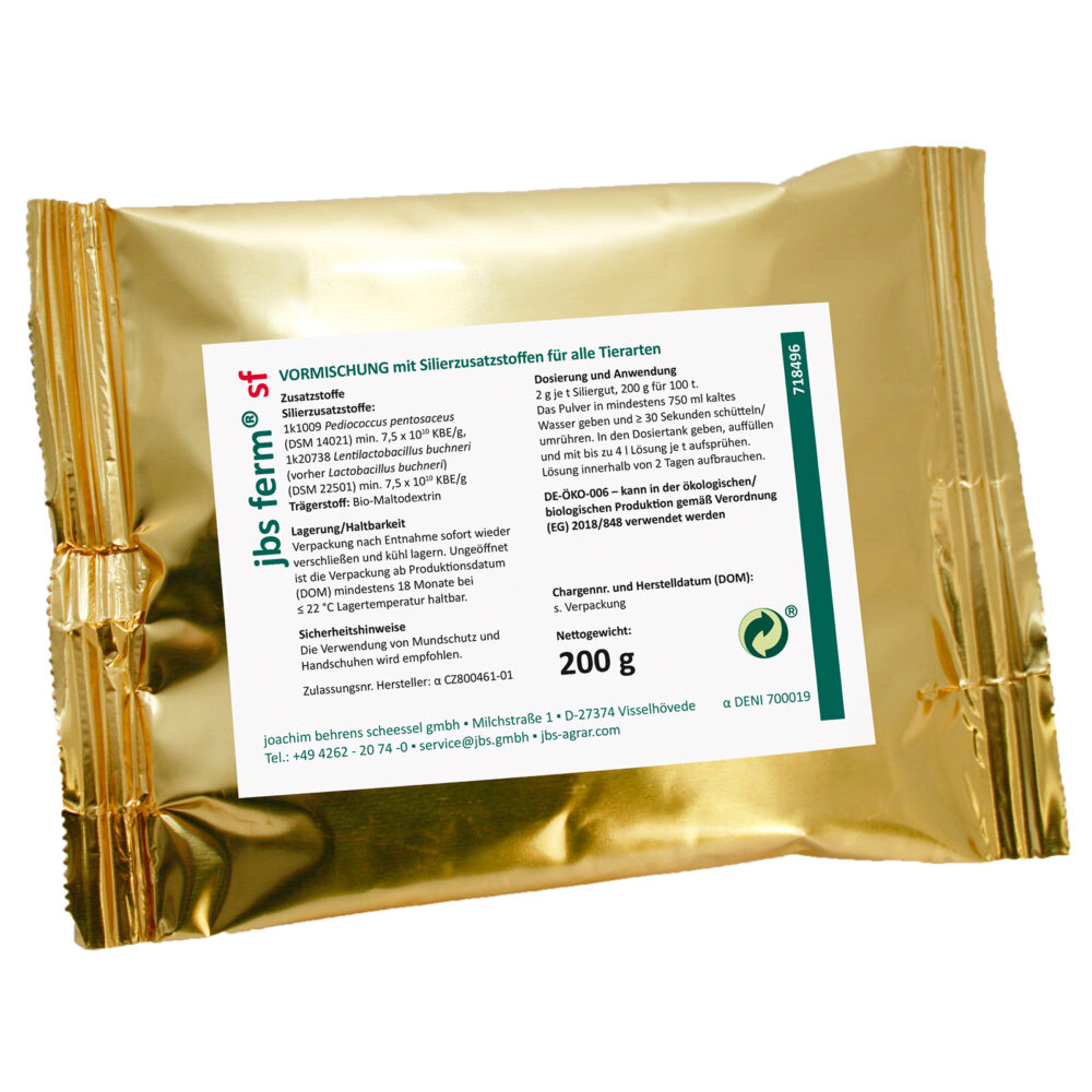 Das jbs ferm sf Siliermittel sorgt für eine schnelle und effiziente Silierung aller Futterpflanzen mit 25 bis 50 % Trockenmasse. Dank seiner hohen Wirksamkeit gegen Hefen und Schimmel bleibt die Silage im Durchschnitt 5 Tage länger stabil und behält wertvolle Nährstoffe.