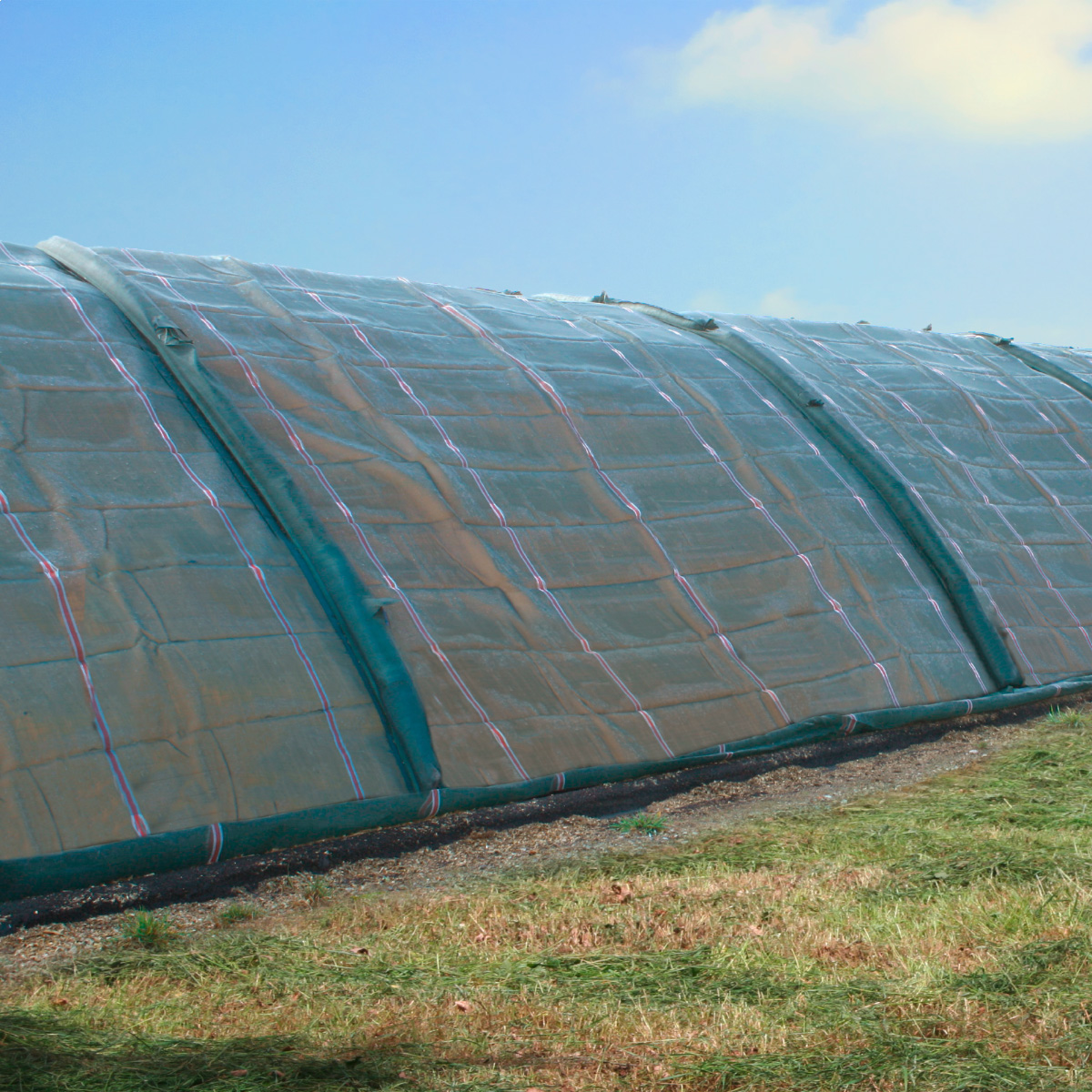 Schneide den Barriereschlauch je nach Silobreite passend ab und verschließe ihn am Ende fest mit Kabelbindern. Lege den Schlauch über den Silo, fülle ihn an den Schrägen mit Silosäcken und belege ihn auf dem Silo mit Silosäcken. Lass den Schlauch beim Entnehmen der Silage so lange wie möglich hinter der Anschnittkante liegen, um den Lufteinzug und damit den Verderb deiner Silage zu minimieren.