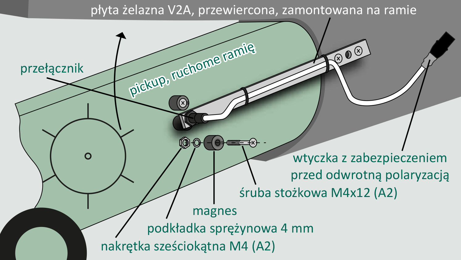 Przełącznik umieścić w prostownicy. Przymocować prostownicę (początkowo za pomocą zacisku śrubowego) do ramy stacjonarnej tak, aby włącznik magnetyczny znajdował się w pobliżu dolnej krawędzi ruchomego ramienia Pickup. UWAGA: Tymczasowe mocowanie musi znajdować się w odległości co najmniej 1,5 cm od środka ciężkości prostownicy! Teraz przymocować najniższy magnes naprzeciwko ruchomego ramienia Pick up, około 3 - 4 cm nad przełącznikiem, a pozostałe dwa nad nim w niewielkiej odległości.